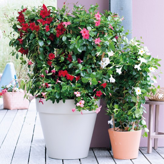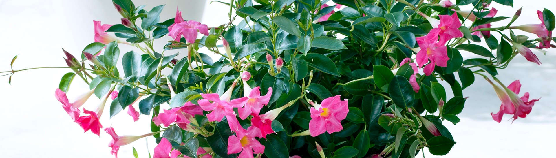 De Mandevilla is een van de meest dankbare, bloeiende tuinplanten. Vanaf mei tot de eerste vorst verrast de plant met witte, gele, roze of rode trompetvormige bloemen. Niet voor niets is de Mandevilla dan ook een ontzettend populaire bloeier in tuinen, op balkons of terrassen.